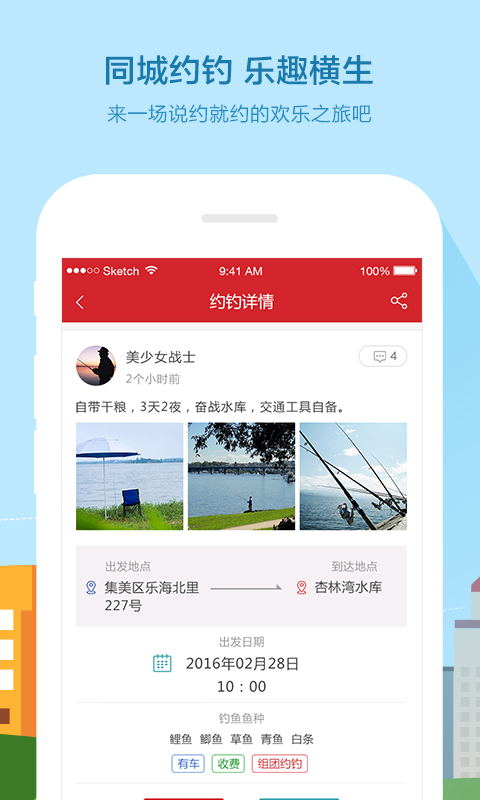 约钓:与钓鱼人一起同行,交流钓技,搭车方便出行,新手还能拜师学艺,定期参与团队活动