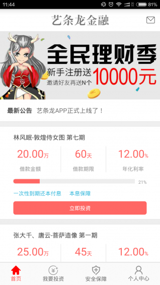 1、艺条龙理财端APP重磅上线,100元起投,预期年化收益8%~18%。。
