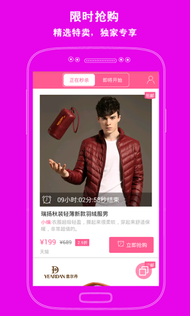 9块闪购app是国内首家9块闪购限时秒杀购物平台。平台上每天上午10点准时开抢,汇集各大商城(淘宝、天猫、聚划算、京东、一号店、亚马逊、苏宁易购、国美等)海量限时秒杀的特价商品,所有商品都是有质量保障的,让广大消费者可以放心大胆的去抢购。