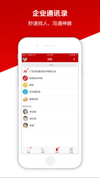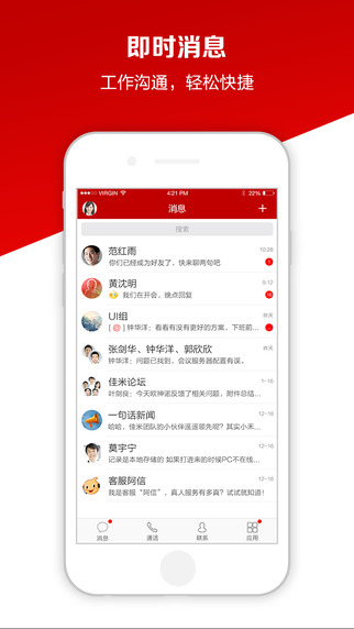 ①极致的工作沟通方式:企业IM、文件、语音、图片以及实时电话会议,快速的沟通方式,极大地提升协同办公效率②方便的办公通讯录:全员实名的企业通讯录,无需逐一加好友、存号码,找人只需轻轻一点。