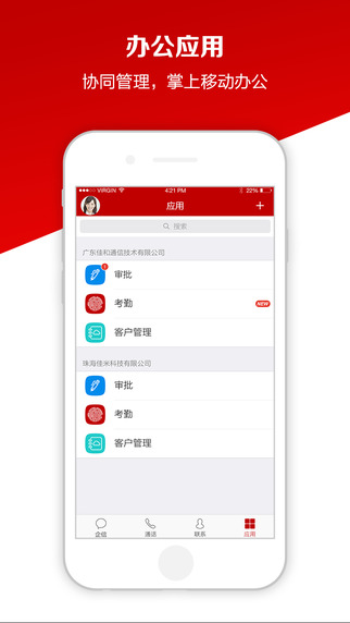③统一的移动办公入口:丰富的移动办公应用统一接入,只需一键登陆所有的办公工具。