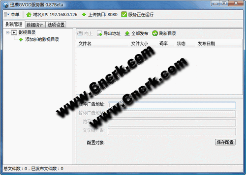 服务器端是配合Gvod播放器为资源站长提供发布资源和广告的工具,易操作,传输快;资源成功发布后,点播站长即可免费调用,轻松实现高清、高速的Gvod线点播功能。