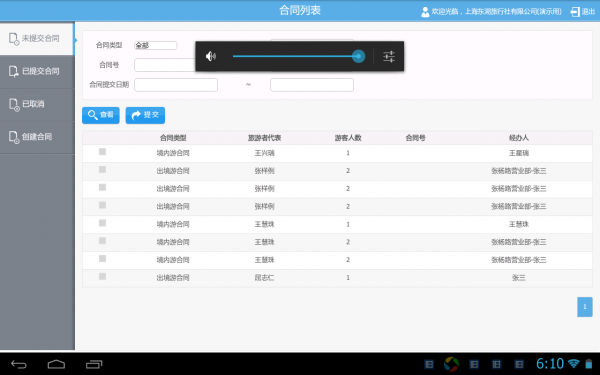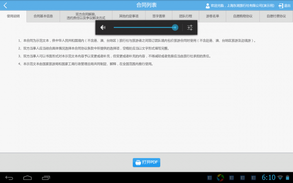 为旅行社提供便利,分为两种登录方式,旅行社登陆与游客登录.每种方式都可以使看自己的电子版合同(pdf)、签字、收取游客代表验证码信息。【更新日志】