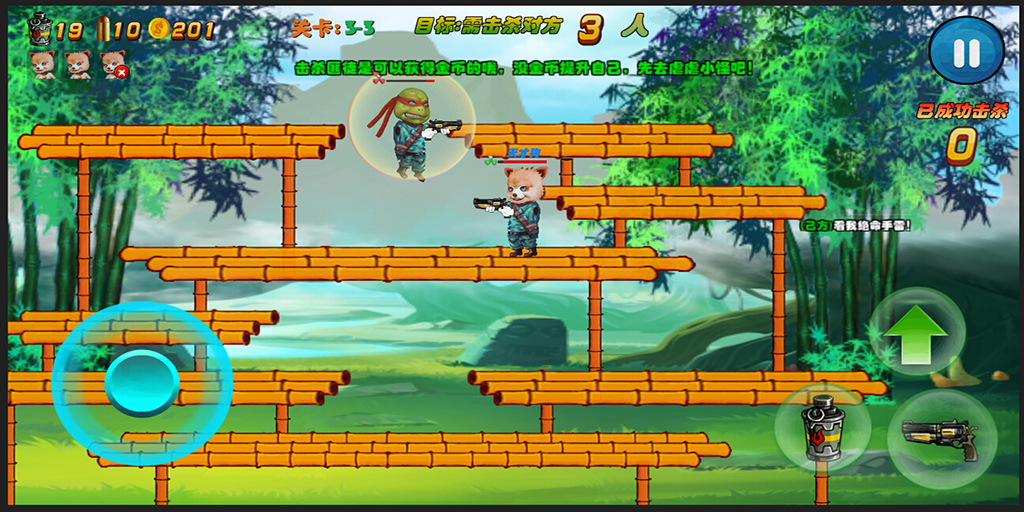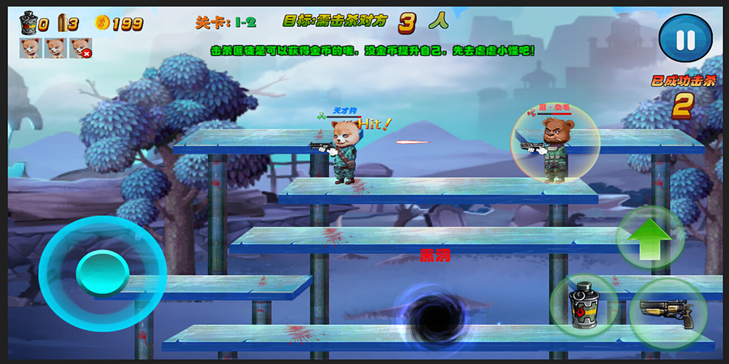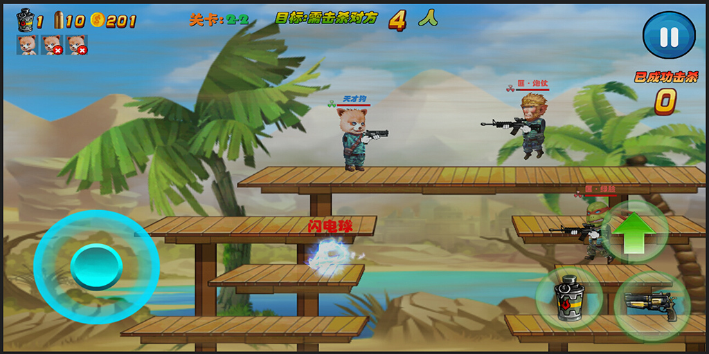 这是一款类CS的2D枪战手游!玩家需要控制角色在平台上上下左右移动,攻击敌人,躲避敌方射来的子弹和系统随机刷出的各种陷阱,还有各种补给可供拾取。手雷战?狙击战?单对单?围殴?每关都有不同的玩法,!更多内容期待你的探索,来吧,勇士,拿起你的武器,干掉你的敌人,让我们见证一个从小兵到军神的传奇吧!
