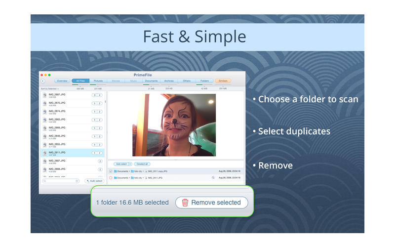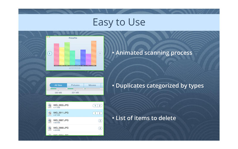 DuplicatesFinderMac版拥有快速扫描的算法,可以扫描在多个文件夹或驱动器中的文件。它可以获得外部驱动器及安装的网络文件夹的支持。扫描过程以动画形式显示在软件界面。支持选择扫描隐藏的文件夹。DuplicatesFinderMac版以可视化的图表报告文件清除内容,反馈用户快速清理建议,同时内置使用的帮助提示。支持预览和快速查找每个文件,支持重复排序,按名称,大小,总的大小,类型,重复计数等等条件进行。