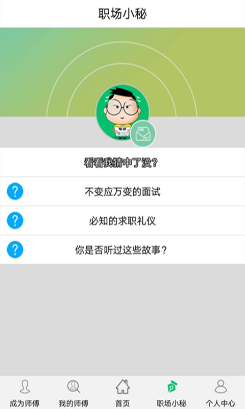师傅来也app它可以为您提供各行各业的前辈为您指点迷津,传授面试技巧和经验,让你少走很多歪路,让每个人都能找到一份称心如意的好工作。