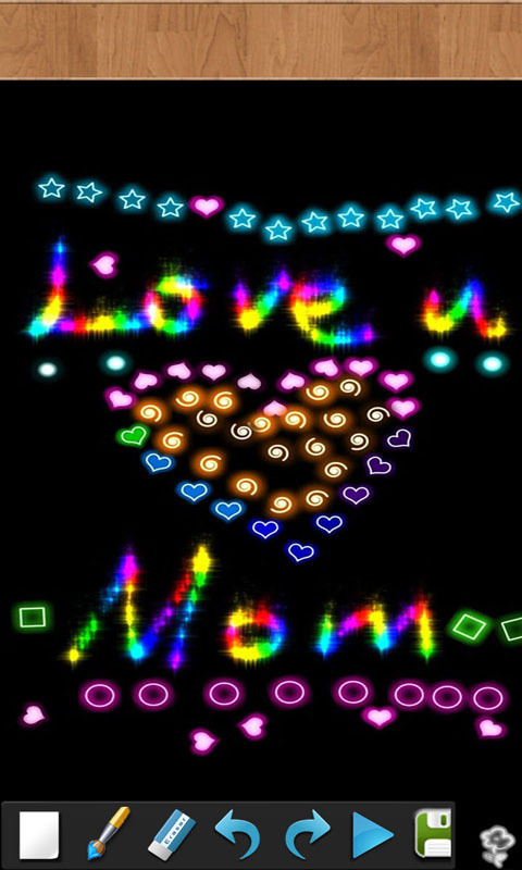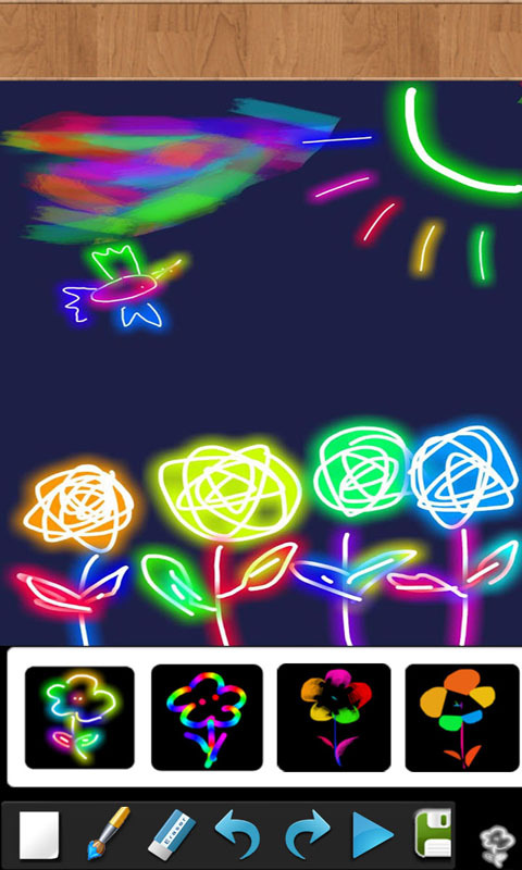 画笔之间,时而如烟花般绚烂,时而如霓虹灯般梦幻,时而如朴实俊俏的素描,时而如纯净迷幻的水彩,各式画笔,无限创意的色彩。随心创制,绘成自己的图案。小朋友的奇思妙想,大人们的精心构思,创作出属于自己独特的作品。同时也可以分享给朋友们。内含十几种不同的画笔和绚烂迷幻的彩笔。内含相册,不但可以保存成品图案,还可以保存整个创作过程的录像。小朋友只要点击播放,就可以观看他自己的创作过程,期间可以重新修e改编辑。