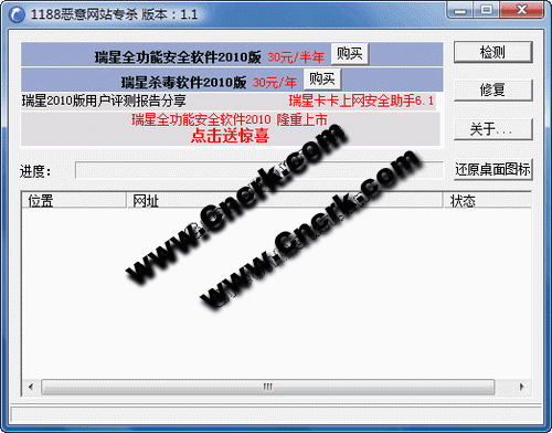 瑞星恶意网站专杀工具 V1.1.0.2 简体中文绿色免费版 近来一种劫持 IE 浏览器的病毒流行,该病毒会在桌面上建立多个假 IE 浏览器快捷方式,当用户点击后,会自动访问 1188.com 恶意网站,并对用户的电脑安全构成威胁、造成进一步的破坏。除了 1188.com 之外,该病毒还会修改成多个其它恶意网站。