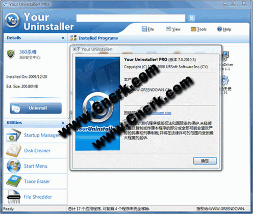 Your Uninstaller V7.0.2010.10 英文绿色特别版 利用Your Uninstaller! ,你可以轻松查看到各种工具软件的卸载信息,根据卸载信息的提示,可以知道哪些程序可以被彻底地卸载;除了具有卸载功能外,该程序还具有启动程序管理功能,利用该功能你可以自定义各种需要随计算机系统一起启动的应用程序;此外,为方便你使用鼠标右键,该工具还新增了IE上下文菜单管理功能,利用这个功能你能提高计算机的操作效率。