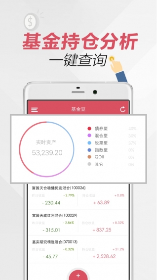 基金豆除了提供组合收益查询,还将展示你的基金配置情况,股基、债基、混合基、QDII…各类基金配比了然于心。在风云突变的市场里屹立不倒,全靠这颗豆子啦!
