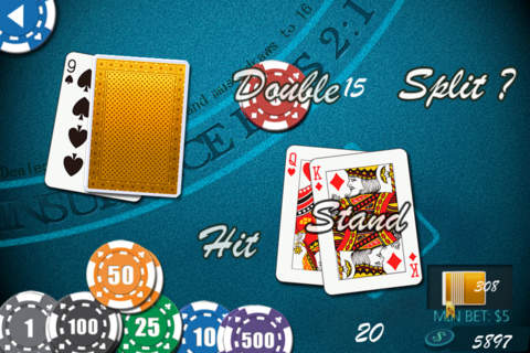 玩家的目的是要取得最接近21点数的牌来击败庄家,但同时要避免超过21点而爆牌。点击筹码下注,点击Deal则开始游戏。可以拖动筹码下最大注;也可以拖动拿回所有筹码。特别奖励会给你带来额外收入,当你的筹码不够多的时候,每小时都会赠送100个免费筹码。