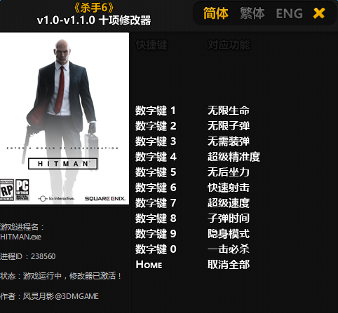 杀手6十项修改器是您最佳的游戏修改器选择,在这里你可以轻松的对游戏进行修改,包含了10项强大的功能可以修改,无论是生命值还是子弹、精准度等都可以在这里进行调整。