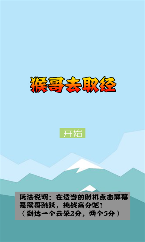 这是一款休闲益智的游戏,猴哥要去取经啦,快来助阵。点击屏幕寻找适当的机会跳上云朵,越过越多就越高分,想挑战吗?