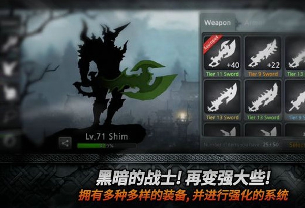 《暗刃 Dark Sword》是一款画面非常精美清新带有暗黑风格的横版战斗类ARPG游戏,游戏操作简单,虚拟按键设计人物技能一目了然,玩家需要控制主角去完成一系列的战斗任务,展现你强大战斗实力的时刻到了!游戏采用暗黑风格的画面设计,游戏画面并不算精致,但是游戏打击感十足,玩家在丰富的关卡中与敌人作战,紧张刺激的战斗专为喜欢动作游戏的玩家打造!游戏在内容上比较丰富,将提供超过100个关卡供玩家尽情攻略,其中自然暗含数不尽数的怪兽静候光临。如果你仍觉不过瘾,还可挑战硬核模式,届时将要在有限的时间与能量限制中完成任务,难度暴涨,开发商表示一般人都会铩羽而归。总的来说,虽然有暗影格斗系列的珠玉在前,但《暗刃》激烈爽快的格斗玩法还是令人振奋的,剪影风的运用也让整个游戏蒙上一层神秘面纱,毫无疑问是值得一试的!战斗过程更为激烈。《Dark Sword 暗刃》在画面场景以及角色形象上另辟蹊径,放弃了传统的概念而是引入剪影的表现形式,并且在角色招式和动画特效上表现出了十足的诚意,使得整个游戏的打斗过程看起来相当的流畅。游戏共设置了超过100个关卡以及大量的怪物,而随着游戏进程的加深,战斗也会越来越激烈,喜欢挑战的玩家还可以尝试下更为困难的最高难度模式。【软件特点】