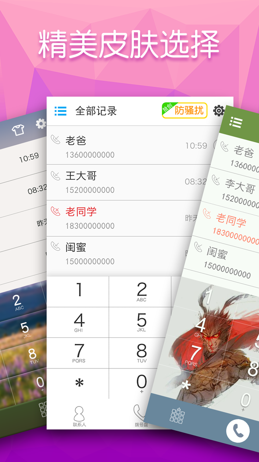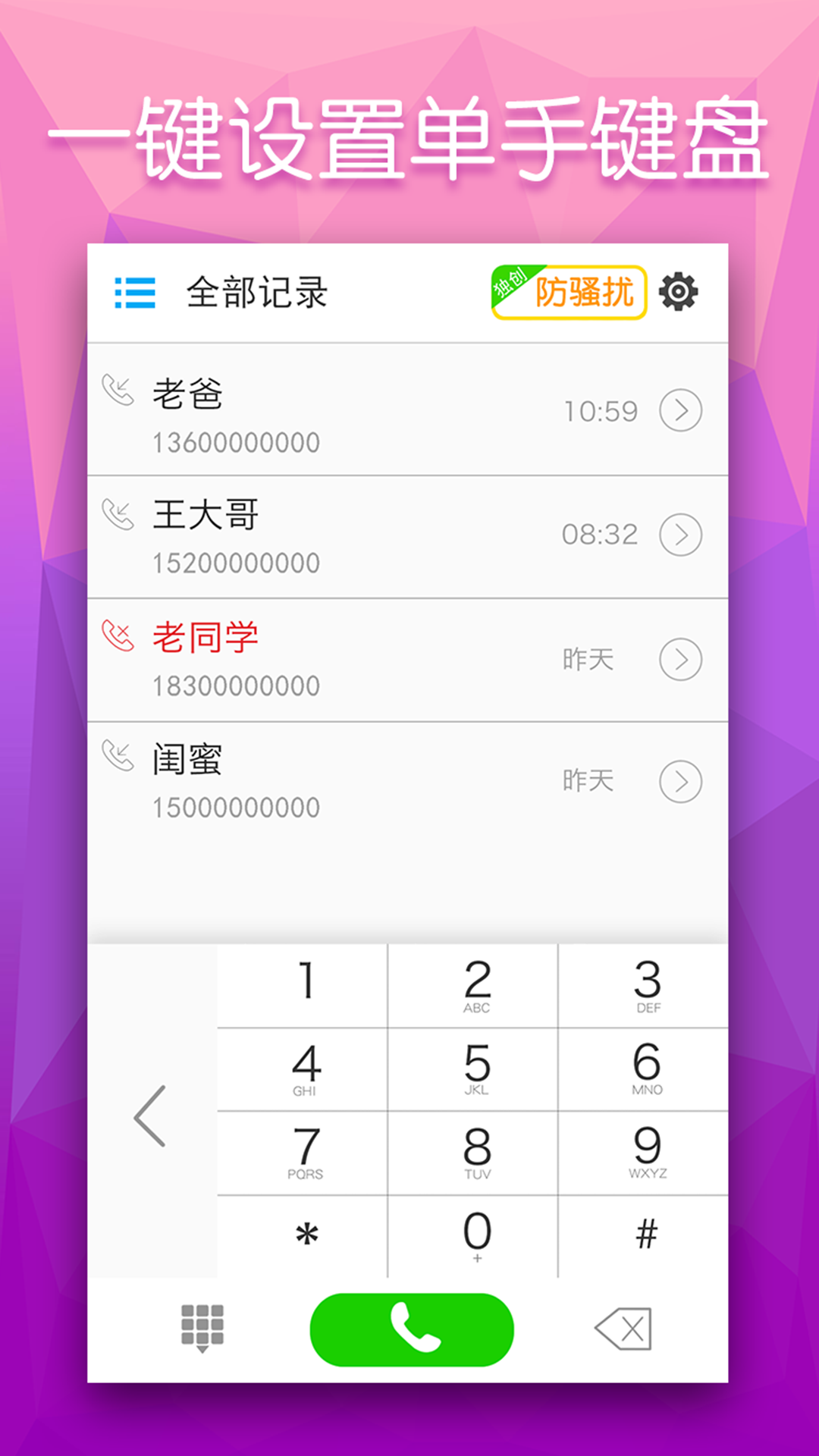 多多电话是一款专注于为用户提供优质拨号体验的拨号软件,其拨号键盘智能检索功能给用户带来了高效的极速拨号体验,用户可根据联系人名字的全拼,简拼,电话号码片段检索通讯录,且通话记录下拉即可查看常用联系人,把用户从繁琐的系统拨号中解放出来!1、智能防骚扰,自定义“时间段”以及“城市”来屏蔽骚扰电话!