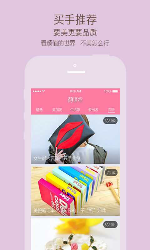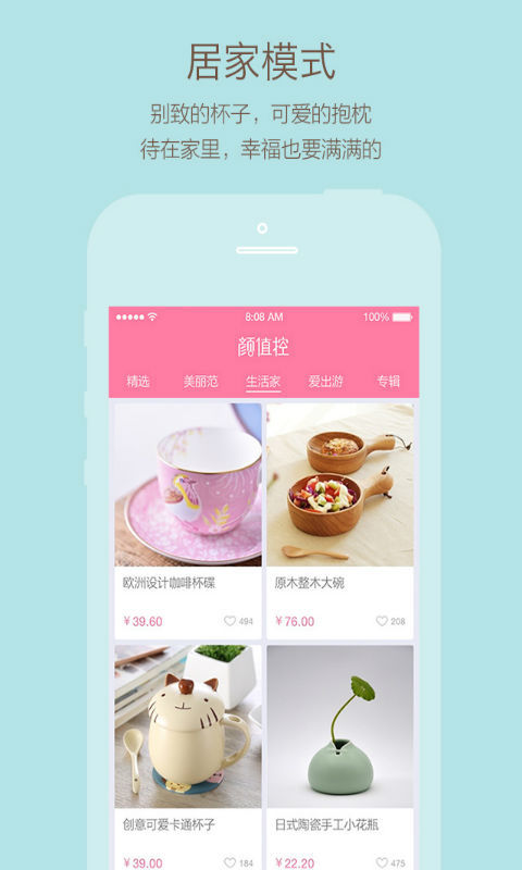【美丽范】:精选高颜值饰品,满足你的少女心女神范;如果你在逛街时常常被精美的小饰品吸引,那么美丽范一定会让你欲罢不能。【生活家】:不管你是寝室党,租房党或者有房一族,上颜值控选一件香薰摆件,一个别致的杯子,一对优雅的抱枕,就能提高生活品质哦^^