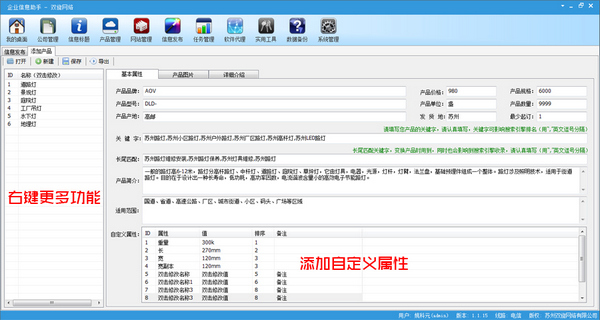 企业信息助手是苏州双旋网络有限公司研发企业产品群发推广软件,于2015年正式上线,软件免费版永远开放,永远免费使用。企业信息助手服务于个人,企业。只要您有产品或是有服务,只要您想在网络上遍布您的产品信息,那么选择我们吧。这正是我们的专业,专业针对B2B电子商务平台、BBS论坛、博客等。只要您能用手工发布填写信息的网站,又没时间每天去注册、发布、刷新信息,那么还是选择我们吧!企业信息助手都能让您实现。【软件特点】