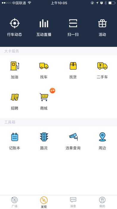 车辆管理、路况分享、发货配货、招聘找车、周边加油站、精彩活动,等待您的发现!