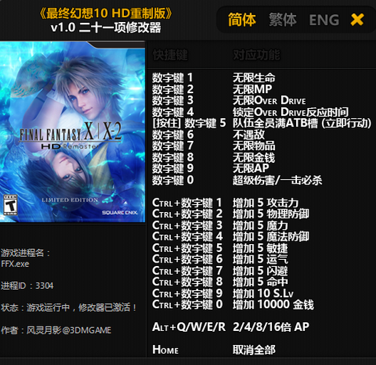 最终幻想10修改器是专为游戏《最终幻想10》设计的一款游戏辅助工具,这款工具拥有无限生命、无限MP、无限物品、不遇敌等多项功能,让玩家能更好的体验游戏的乐趣!
