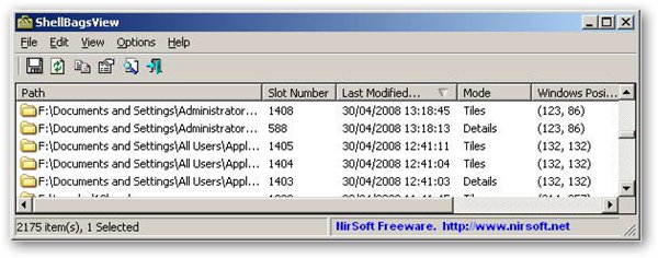 ShellBagsView是一款简单易用的软件 ,每次你在资源管理器打开文件夹,Windows自动保存到注册表此文件夹的设置。而ShellBagsView将显示了Windows保存的所有文件夹设置列表