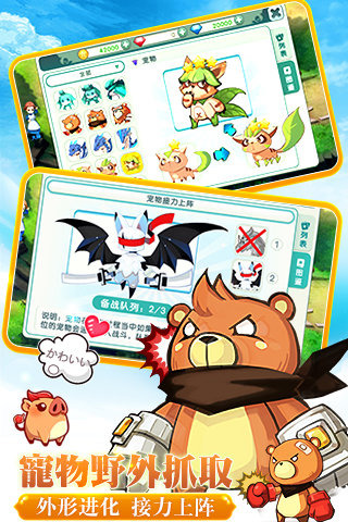 3、宠物野外抓取,培养进化不仅提升实力,还能变化多种外形,真正见证宠物的成长!