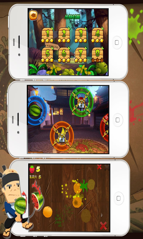 光头强之熊出没切水果是一款刺激好玩、容易上手却教人难以离手的动作游戏,玩家将会在游戏中扮演光头强保卫水果, 熊熊用锋利的刀切开各种水果。只需将手指扫过屏幕,就能像忍者战士般痛快地切开溅出美味果汁的水果。 但注意不要触碰混杂其中的炸弹,一旦引发爆炸,你的刺激冒险便会瞬间终结!