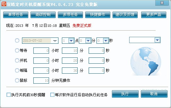 宣皓定时关机提醒系统 基本的九大功能:定时关机、定时重启、定时锁定计算机、定时打开网址、定时关闭指定的程序、定时断开网络、定时提醒、定时切换