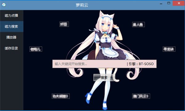 萝莉云点播这个播放器可以播放直接在线磁铁链接和种子文件,软件还支持磁搜索,你可以搜索你想要看到的名称的影片和玩在线游戏这个播放器可以播放直接在线磁链接和种子文件,软件还支持磁搜索,你可以搜索你想要看到的名称和在线的影片。