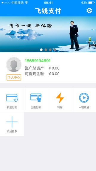 飞钱支付app是一款便民支付的应用,集手机支付和生活应用为一体,飞钱支付app通过加密传输和手机认证等安全保障体系,您可以通过任意一张银联卡在这里轻松实现当面付款、信用卡还款、转账汇款、手机充值、购买理财产品等多种业务。有卡一族,便捷、时尚的全新生活方式,由飞钱支付开始。