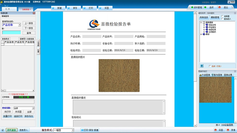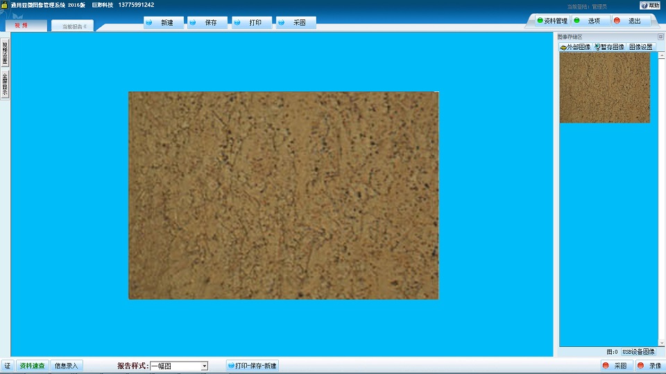 通用显微镜图像管理系统(巨渺软件),支持各种类型的显微镜(金相显微镜、偏光显微镜、体视显微镜等等),通过摄像装置获取显微镜下图像,对图片进行采集,测量,录像等。可打印检查、检测、信息管理等各种类型自定义报告。实现对图像,信息资料的存储,管理,查询,统计等,通过本系统可大大提升显微镜图像及信息资料的管理能力。