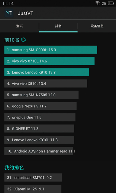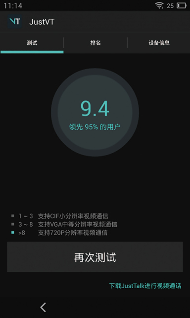 JustVT适用于各类安卓设备,并且拥有庞大的音视频性能参数库,在准确评测出您设备的音视频性能跑分的同时,也会清晰呈现出已测设备的排名情况。