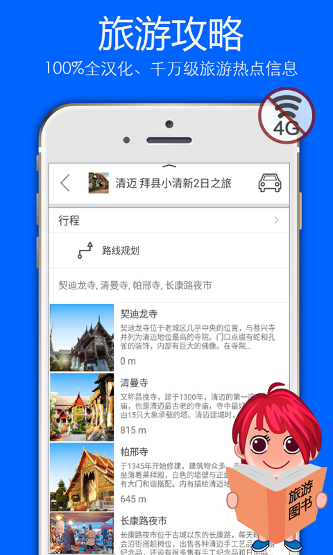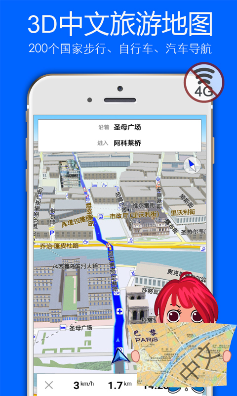 离线导航地图:您可以步行、自行车、汽车导航,并获取在线摄像头及实时路况;也可以查询地铁地图;离线旅游攻略:您可以阅读30个国家的旅游攻略、200条旅行路线,以及成千上万个100%全汉化纯离线的地理信息,并且这些地点信息专门为游客打造,包括三维实景建筑、花园、公园、场馆、湖泊、沙漠、山地等地貌实景。