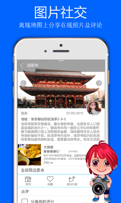 图片社交:您可以在离线地图上分享在线照片及评论,旅图是一个艺术画廊、世界性的旅游信息平台。