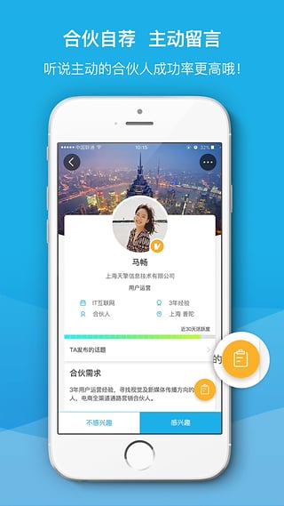 2.新增智能搜索和创业标签,用户可以根据偏好搜索感兴趣的合伙人.