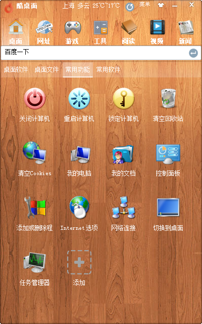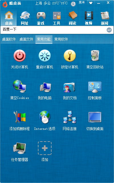 酷桌面助手是一款集桌面管理,生活常用功能,万年历,天气,健康管理及各种常用上网便捷功能为一体的桌面管理好帮手的免费软件.酷桌面助手是款装机必备软件产品,它能让你的桌面从此不再凌乱, 让你在每天办公,上网时以最快捷最方便得处理使用你的日常工具功能.更精心挑选了9套精美的皮肤.酷桌面经过各大安全厂家的认可,绿色安全放心使用!
