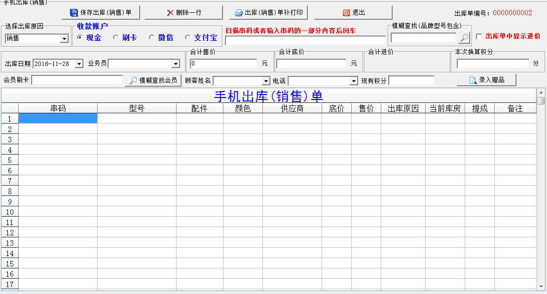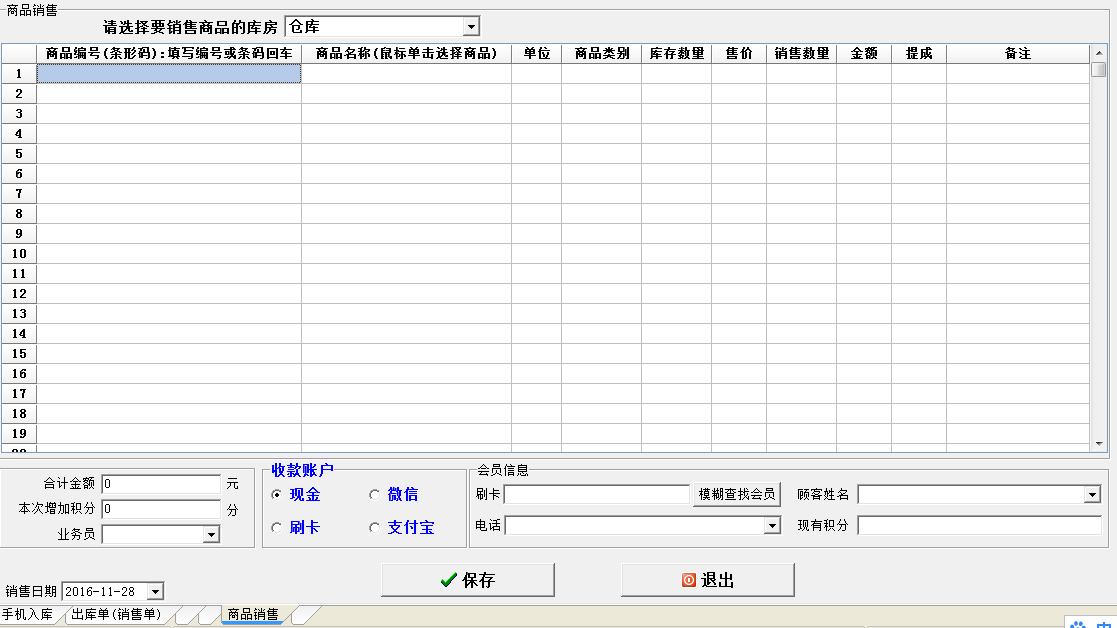 7:手机出库(销售), 销售的时候可以录入赠品(赠品需要提前录入到商品库里、可以给顾客打印销售单),销售后为会员增加积分,销售后可以自动给会员发送消费提醒短信。销售的时候可以选择业务员,给该业务员录入提成。