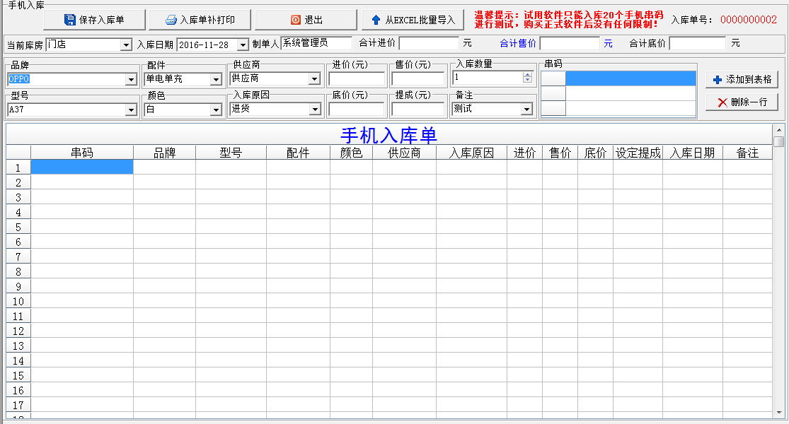 6:手机入库(入库信息包括串码,机型,颜色,配件,进价,售价,供应商,当前库房,入库原因,提成等)。