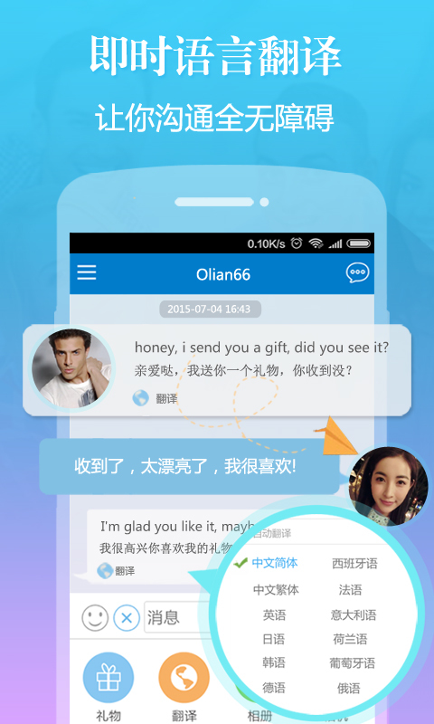 1)12种语言即时互译:Perdateapp支持12种外语聊天即时翻译,帮助用户们实现聊天0距离,打造一个安全、畅通的聊天环境。