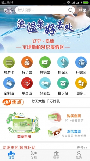 "居游"是沈阳市旅游局的官方惠民平台,平台包含游团、门票、定制、卡务、奖堂及投诉六大栏目,通过平台沈阳居民可享受旅游补贴。