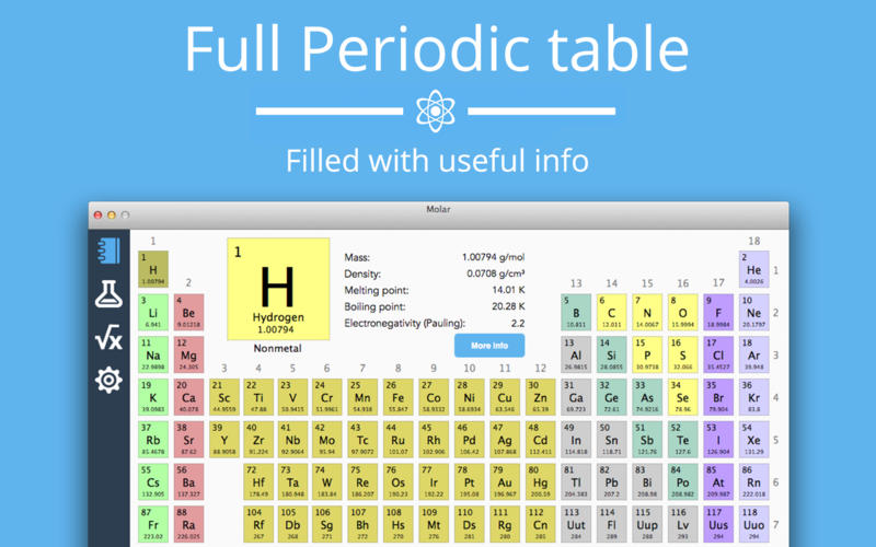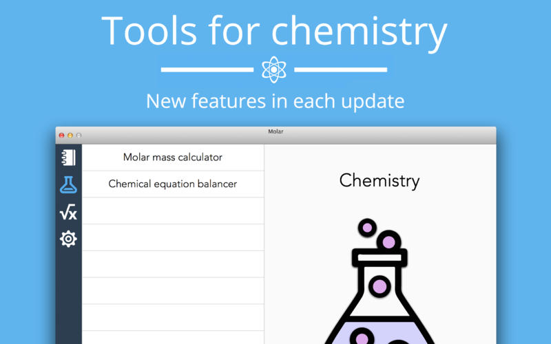 学习化学的工具,你可以快速计算化学分子的Molar质量。你也可以有化学方程平衡和格式复制到另一个,例如,Evernote或笔记工具。