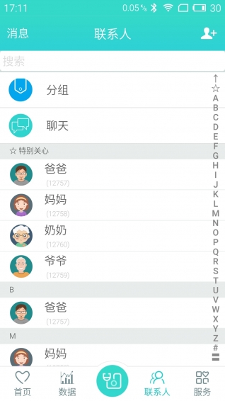 联络--为亲友建立健康档案,帮助他们进行身体生理参数检测,远程关注他们的健康动态。