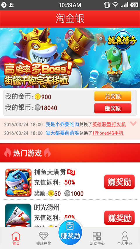 淘金银是一款专门提供给玩家,玩游戏、做任务获取平台币以兑换奖品的应用,专注于为所有手游玩家谋取福利,集游戏任务、热门礼包、热门游戏下载、热门游戏攻略等于一体,具有质量高,更新快,奖励多,奖品好,等诸多优点,不但可以玩丰富多彩的手机游戏,更可以兑换丰富礼品。