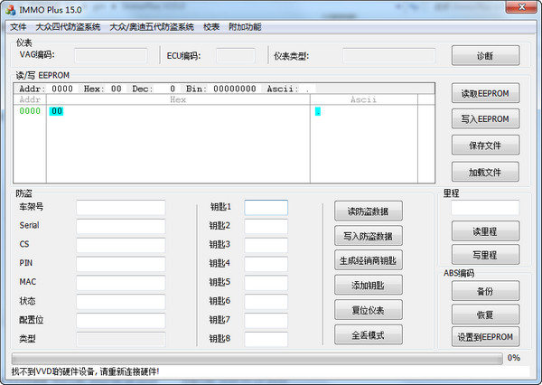 大众四代匹配仪软件(Immo Plus) v15.0中文绿色版,解压运行即是中文,运行前使用时需要连接VVDI硬件设备。【更新日志】