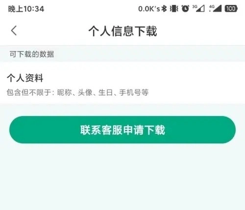 4在个人信息页面,找到并点击联系客服申请的按钮,涉及的个人资料涵盖昵称、头像、生日、手机号等多项内容。