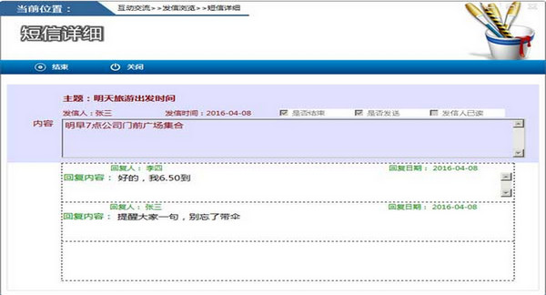 6互动交流:用于内部短信的发送、接收和用户留言管理。