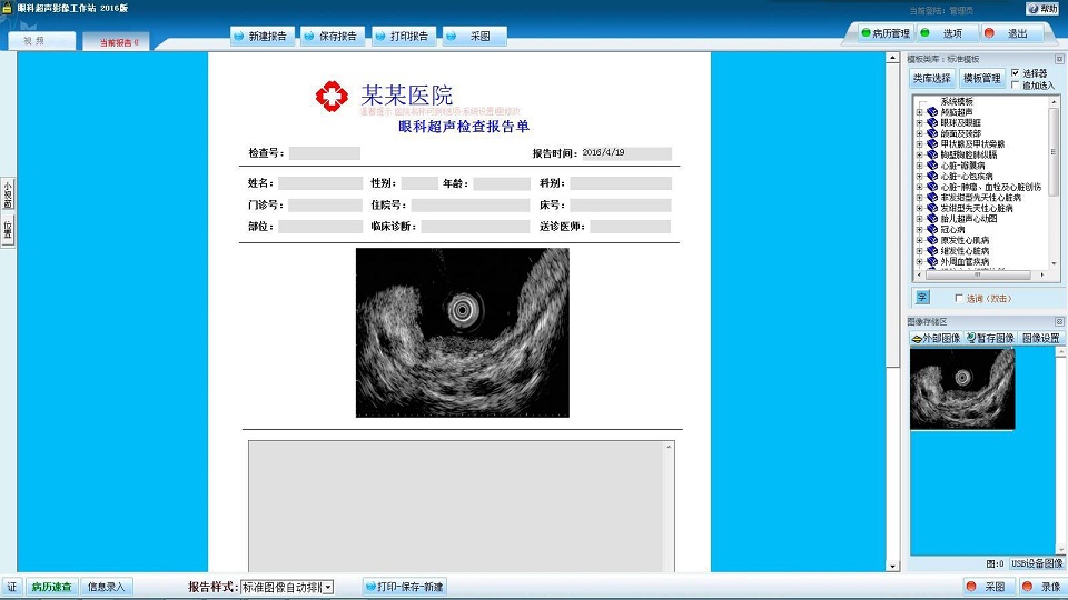 巨渺眼科超声影像工作站是专用于连接眼科B超、彩色超声等设备,实现同步影像显示,可以采集仪器图像及录像,拥有丰富专业的报告单样式以及强大的设计修改能力,可通过大量的专业诊断模板术语,快速完成规范的图文诊断报告。可对病历资料实现快速的查询、统计、共享等功能。
