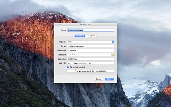 易于安装-只需导航到您的服务器的目标目录,然后选择“保存”。生成的FTP别名可以被放置在桌面上,Dock或其他地方,只需拖放就可以快捷和轻松的上传。它甚至会自动拷贝上传的URL到剪贴板!
