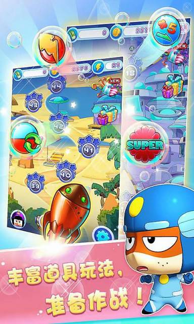 2014年开心超人官方指定游戏,国内首创连线消除+角色扮演相结合的全新玩法, 多彩的泡泡球、数量众多乐趣不同的关卡、搞笑的怪物,还有性格各异、能力超群的众多超人,以及那些能力超群、与众不同的超人机甲带给每个玩家轻松快乐的游戏体验。
