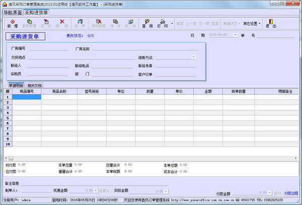 软件中可以方便的输入订单资料,对于建档的厂商及商品,可以快速带出建档信息,未建档商品可以手工输入,也可以设置手工输入自动对厂商及商品进行建档。同时订单资料可以转入进货单,支持分批进货及合并进货。