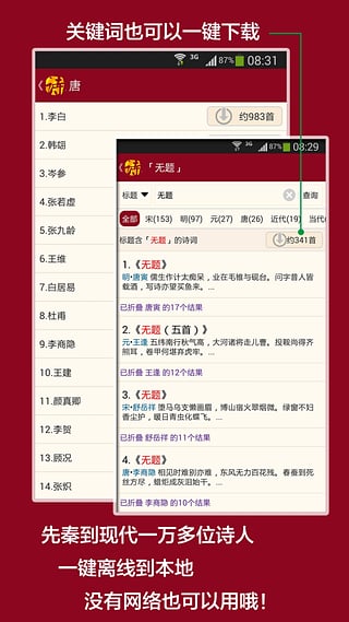 11、支持离线下载诗词,还可下载某个关键词的查询结果哦!!